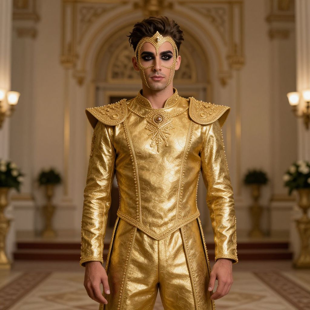 Photograph of a male model in an opulent, gold, ornate medieval-style outfit with intricate embroidery, standing in a grand, luxurious hall with