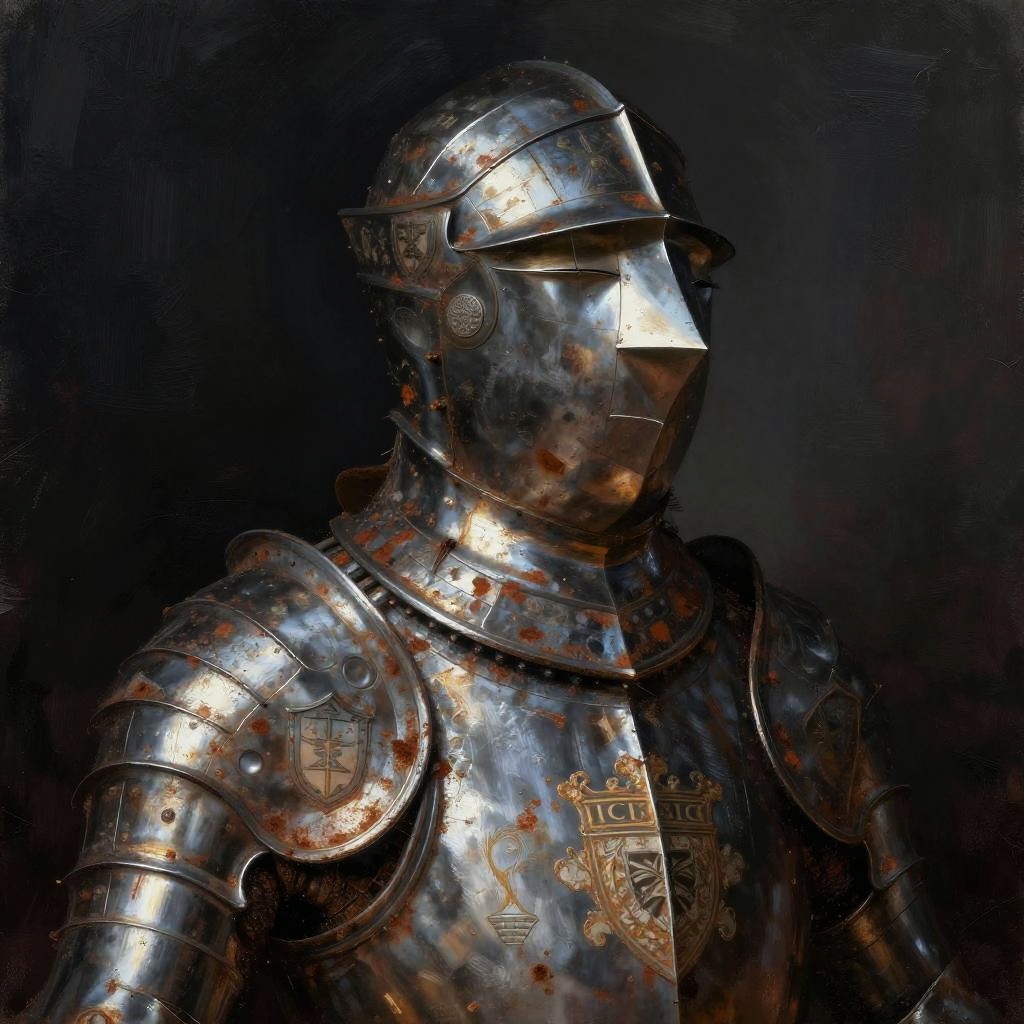 Rusty noble portrait with intricate, corroded metallic armor and faded royal insignia, set against a dark, moody background, textured brush strokes, renaissance style