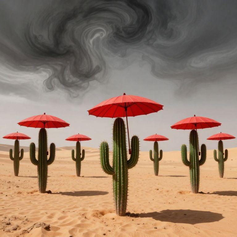 In a surreal desert landscape, an army of anthropomorphic cacti marches beneath a sky of swirling ink, each carrying a vibrant red parasol, embodying resilience and whimsy amidst the arid expanse.