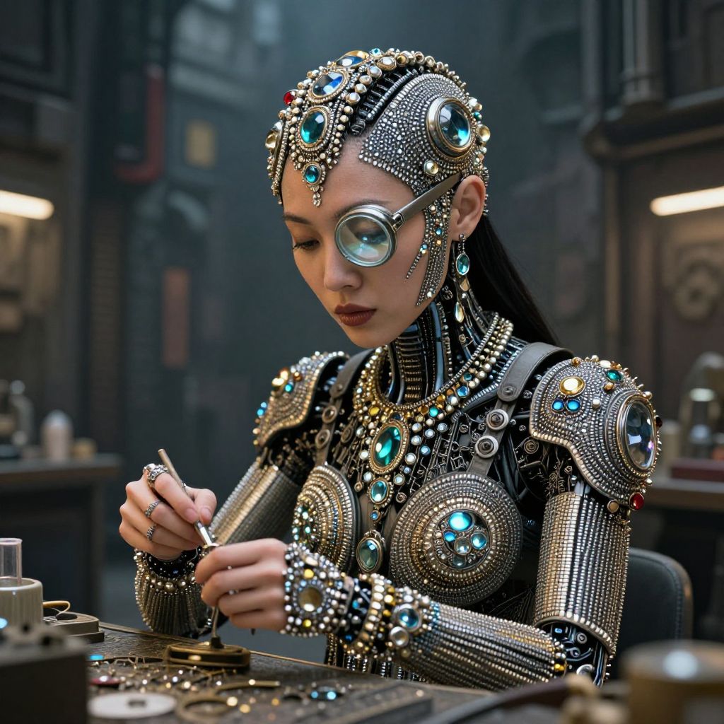 Cyberpunk woman with ornate metallic headpiece and goggles, adorned in intricate silver jewelry, meticulously crafting jewelry in dimly lit workshop.