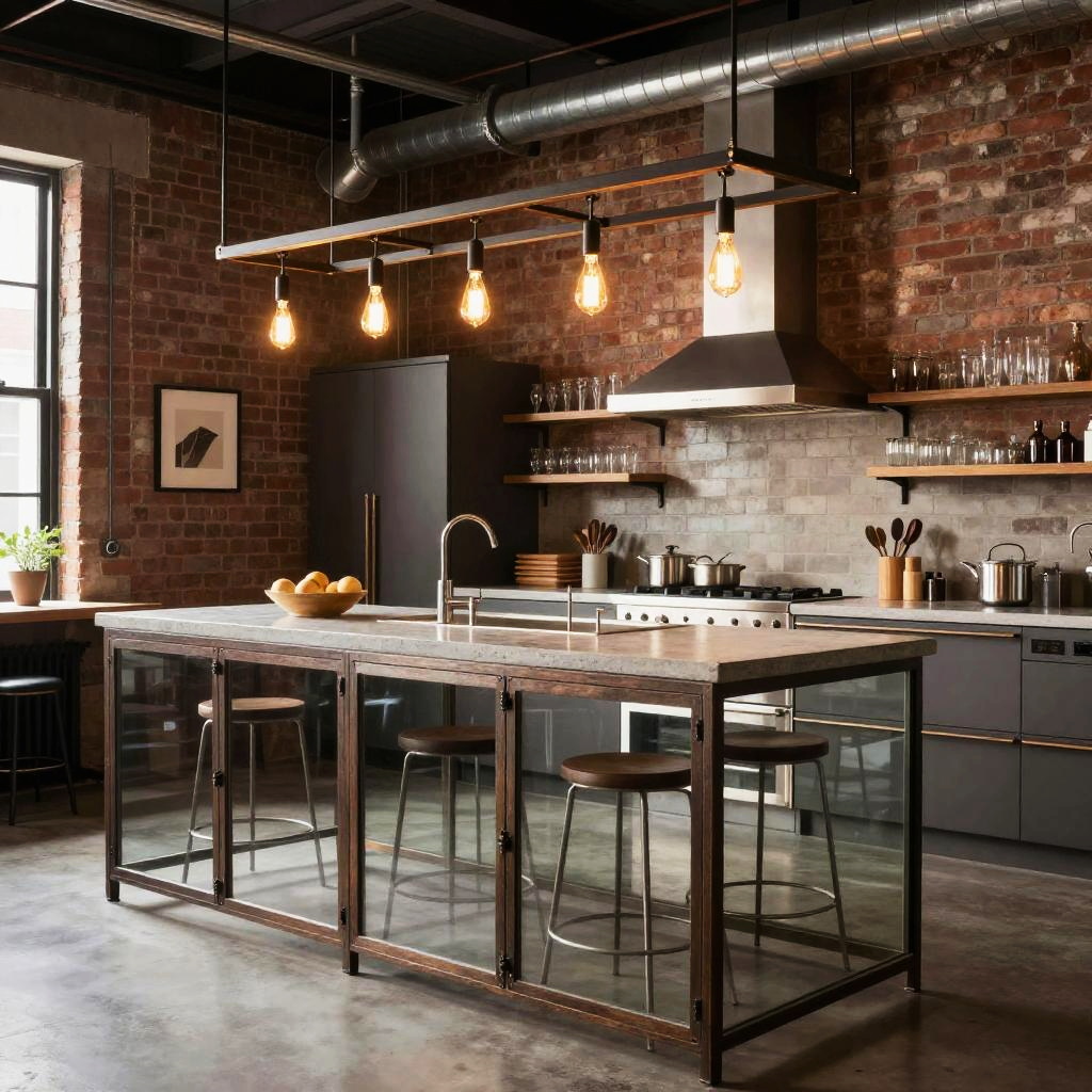 Industrial kitchen island with glass doors, metal frame, exposed brick walls, concrete countertop, Edison bulb lighting, open shelving showcasing glassware, urban loft style kitchen with high ceilings