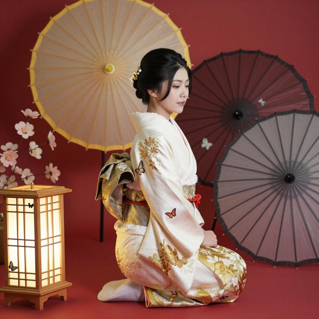 Asian woman with pale skin and black hair wearing a traditional Japanese kimono. She has red lipstick and wears a headpiece with tassels. The kimono is beige with colorful wave and torii gate patterns, and has white lace sleeves. She stands in front of a white-framed window with beige curtains. Her right hand rests on the window frame. The skirt has a ruffled hem. The woman's expression is neutral. The background is light blue. The image has a decorative gold border.