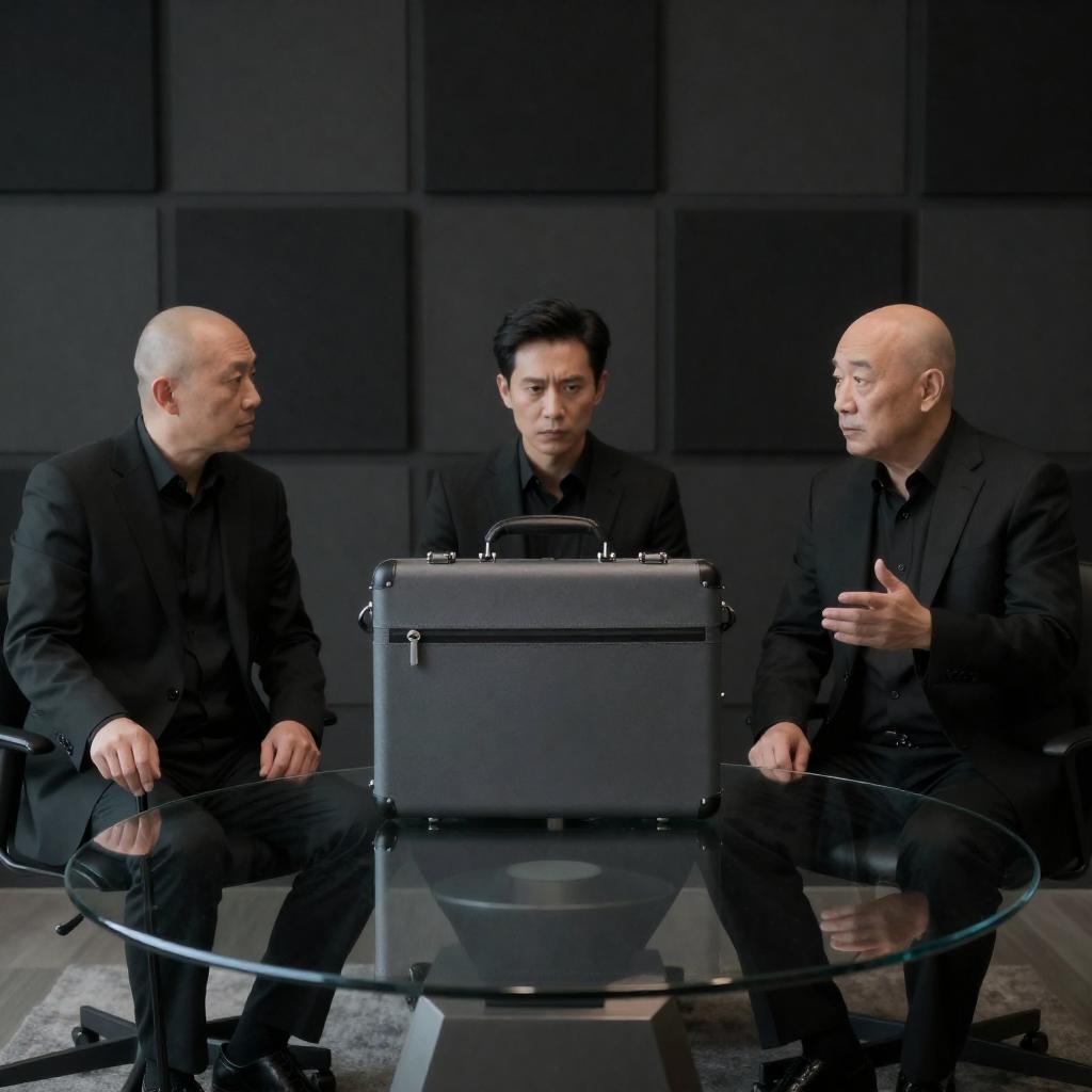Three Asian men dressed in black suits are seated around a round glass table in a modern, dark room with black acoustic panels on the wall. The man on the left is bald and holding a cane, the man in the middle has dark hair and a serious expression, and the older bald man on the right is gesturing with his hand. A gray briefcase is prominently placed in the center of the table.