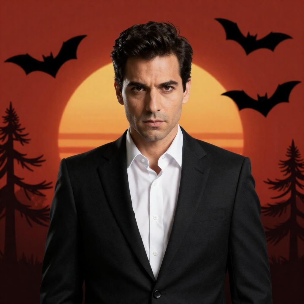 Portrait of a man with dark hair and an intense expression wearing a black suit and white shirt, standing in front of a red and orange backdrop featuring a fiery sun, black bat silhouettes, and tree shapes, evoking a Halloween or spooky theme.