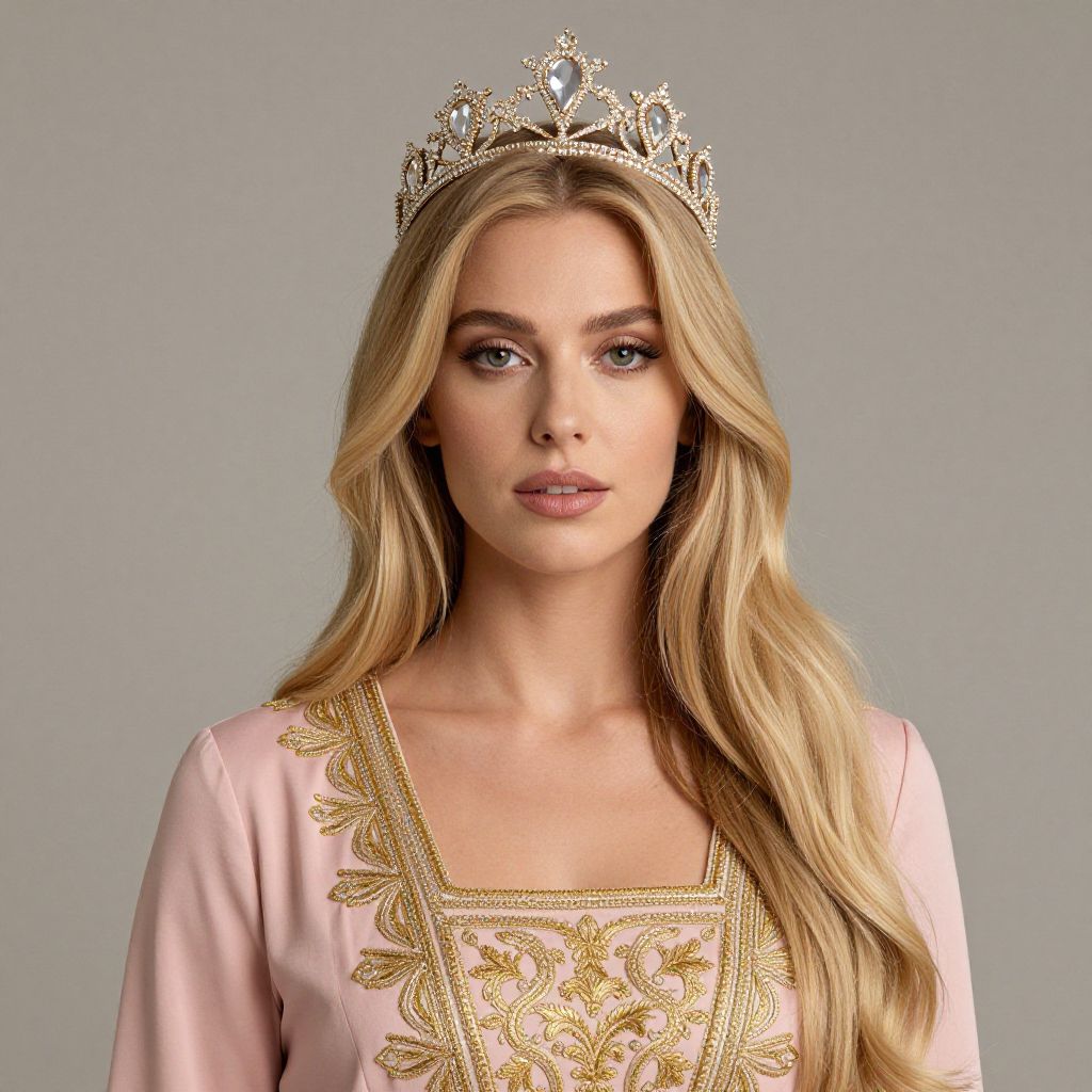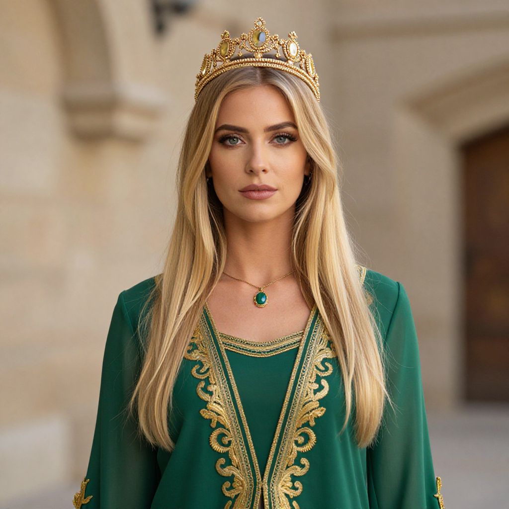 Woman with long blonde hair wearing a green dress with gold embroidery and a crown on her head.