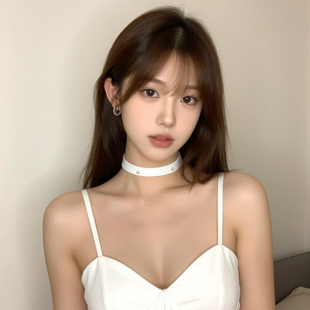 "half bridemaid hairstyle, 1girl, breasts, solo, jewelry, earrings, cleavage, dress, looking at viewer, brown hair, realistic, white dress, choker, necklace, lips, upper body, white choker Realistic photo of casual sexy person with pretty face"