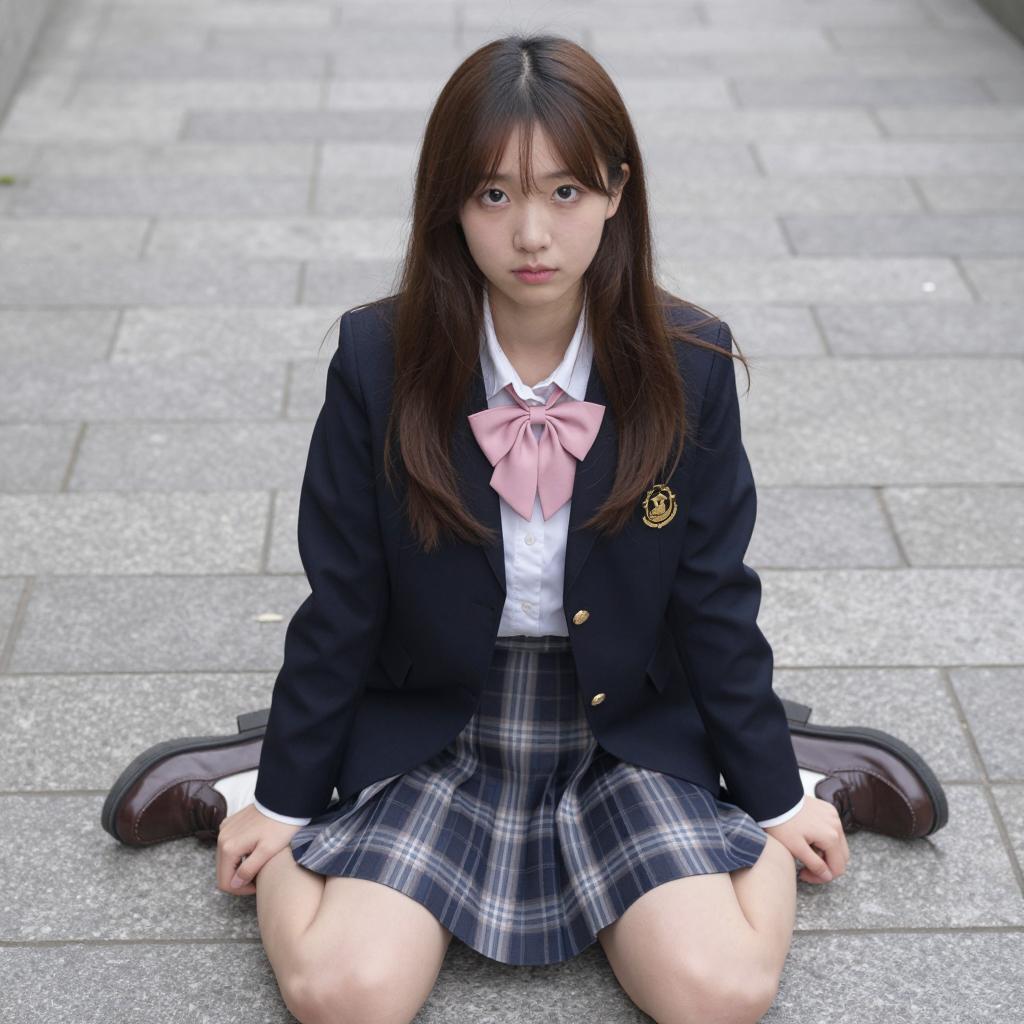 Asian girl with long brown hair and bangs, wearing a gray cardigan, white shirt, blue tie, and green plaid skirt, sitting on a sunlit stone path. She looks down with a neutral expression. Stone path has geometric patterns. Her hands rest on her knees. Sunlight casts shadows on her cardigan and the path.