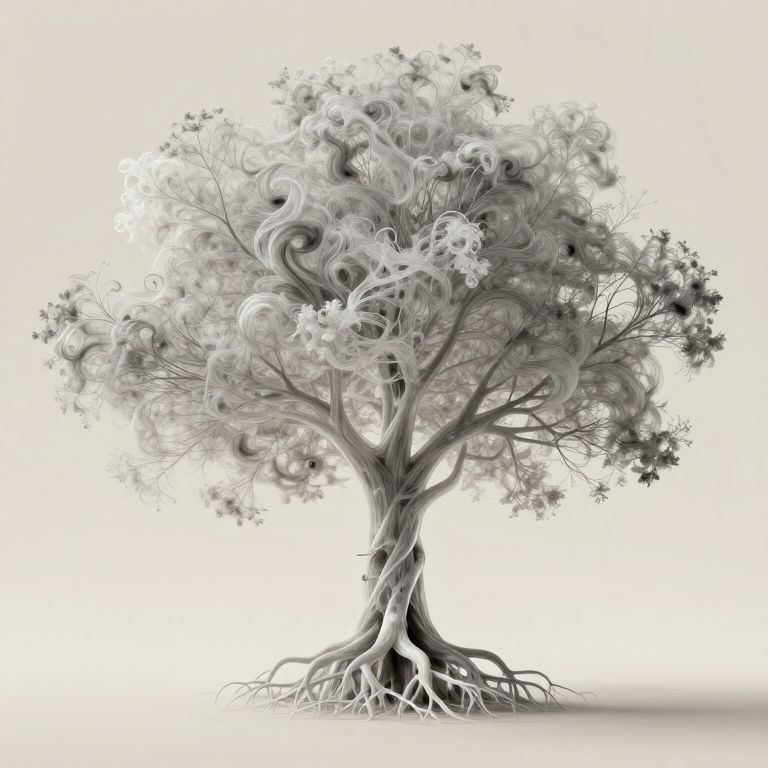 A striking digital artwork depicts a colossal tree with intricate, transparent branches and roots that defy gravity, swirling upward like ink sap against a minimalist beige background, creating a surreal and otherworldly visual effect.