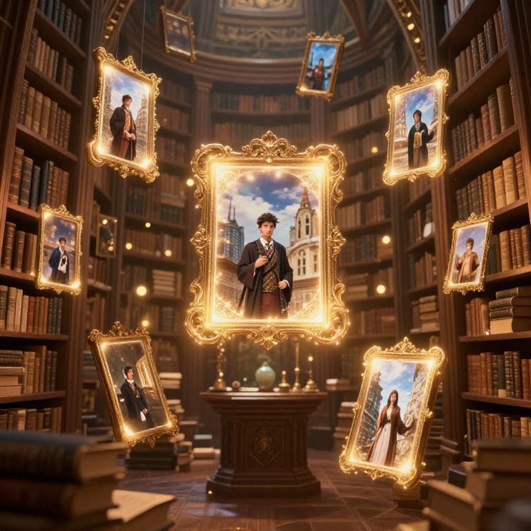 Photorealistic digital image of a grand library with glowing, ornate frames displaying portraits of a man in a suit, standing in front of a historic