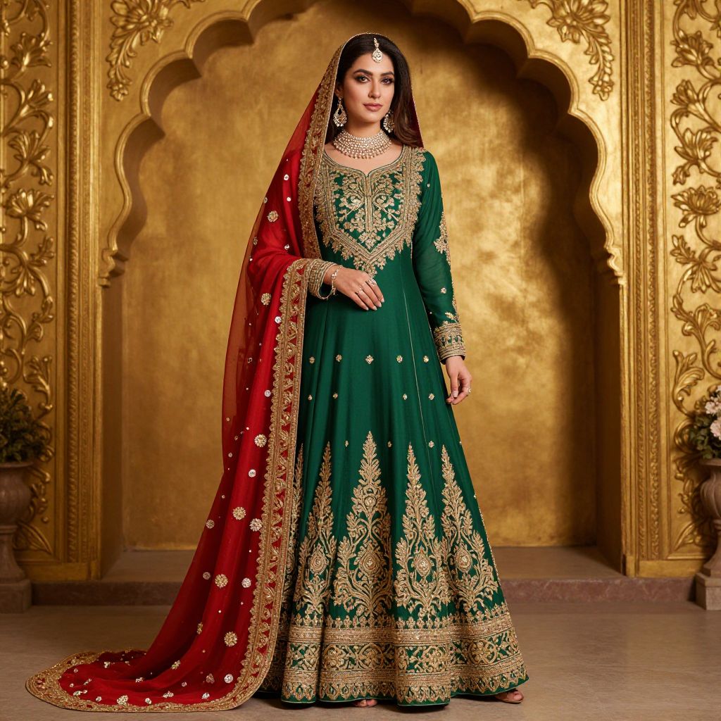 Woman adorned in vibrant Mughal attire, featuring a richly embroidered green dress with intricate gold detailing, complemented by a flowing red dupatta embellished with golden borders, set against an ornate golden archway with floral motifs.