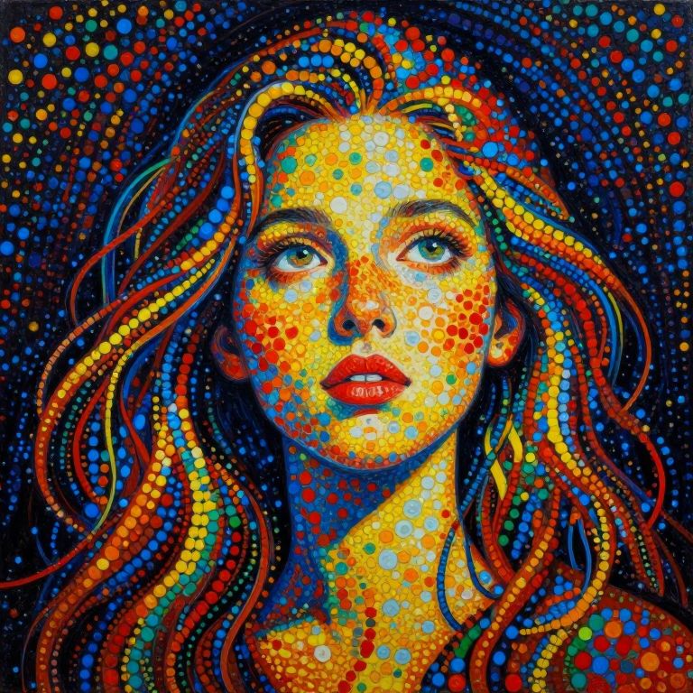 The image is a striking painting composed of numerous small, colorful dots that create a vivid and dynamic representation of a beautiful girl. The dots are of various sizes and colors, including shades of yellow, blue, red, and green, which add a sense of movement and energy to the composition. The girl's face is the focal point, with her eyes gazing upwards, exuding a sense of contemplation or wonder. The dots are densely packed around her face, particularly on her cheeks and forehead, while the background is a dark, almost black canvas that contrasts sharply with the bright, vibrant dots. The overall effect is a captivating interplay of colors and textures, with the dots creating a three-dimensional illusion that draws the viewer's eye into the painting. The composition is balanced, with the girl's face centrally positioned, and the dots creating a sense of depth and perspective. The painting is a testament to the artist's skill in manipulating color and form to create a visually stunning and emotionally evocative piece of art.