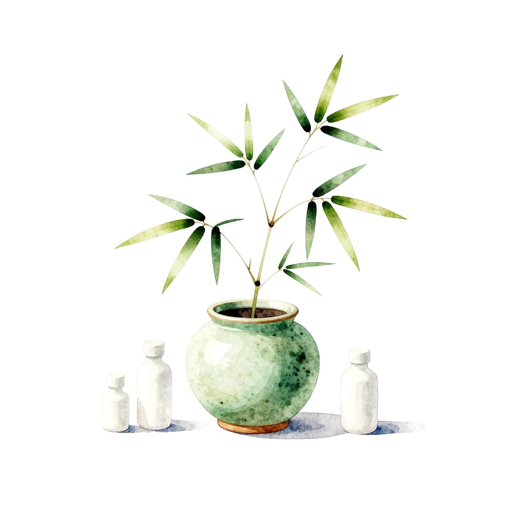 A soft watercolor wash featuring a round pastel green ceramic pot holding a few long slender bamboo leaves, on a seamless white background with three small empty white bottles nearby; high contrast, bold accent colors, thin clean lines, balanced composition, generous negative space, soft studio lighting, modern minimalist aesthetic, crisp edges, no text, no watermark