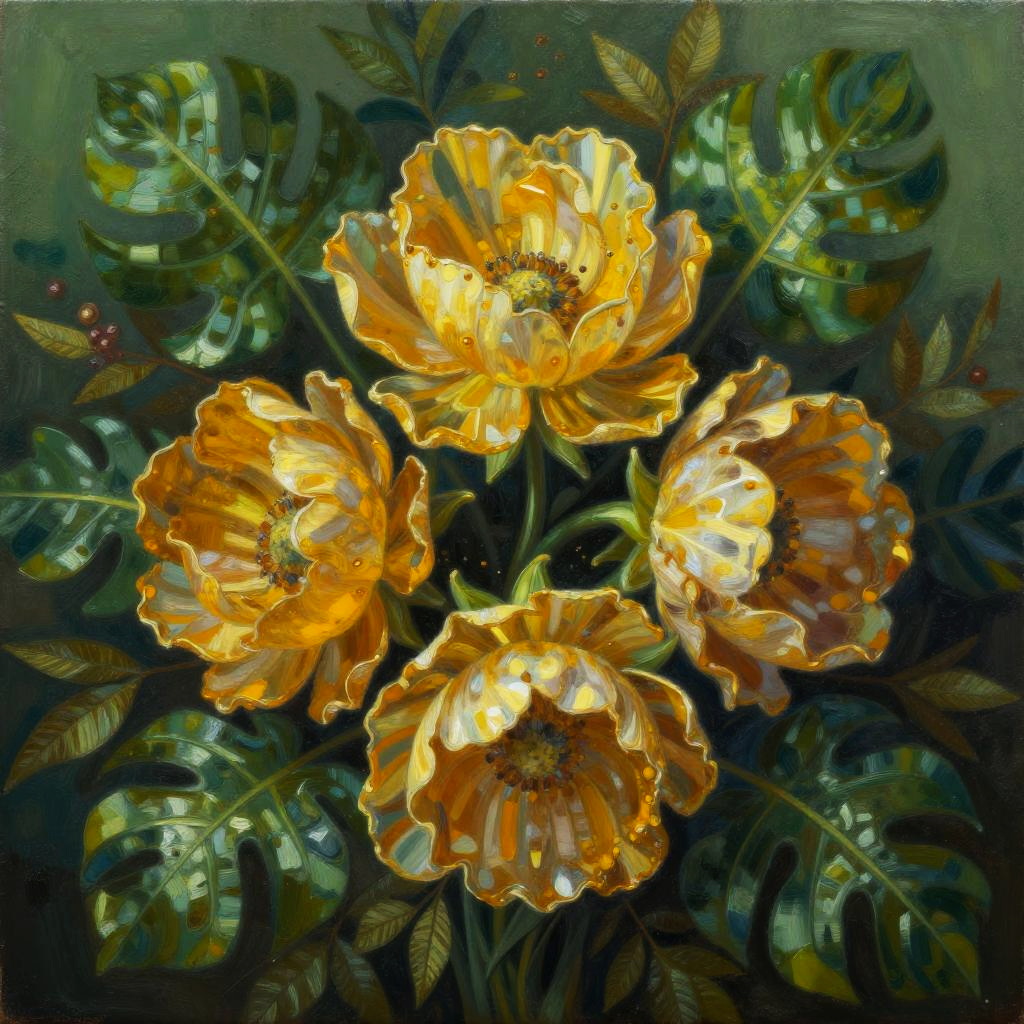 Ivory and jade, vivid colors, high contrast, detailed floral arrangement, oil painting, vibrant, realistic, 4k, ultra-detailed, surreal, dynamic lighting, luxurious, botanical, rich textures, modern, decorative, elegant composition