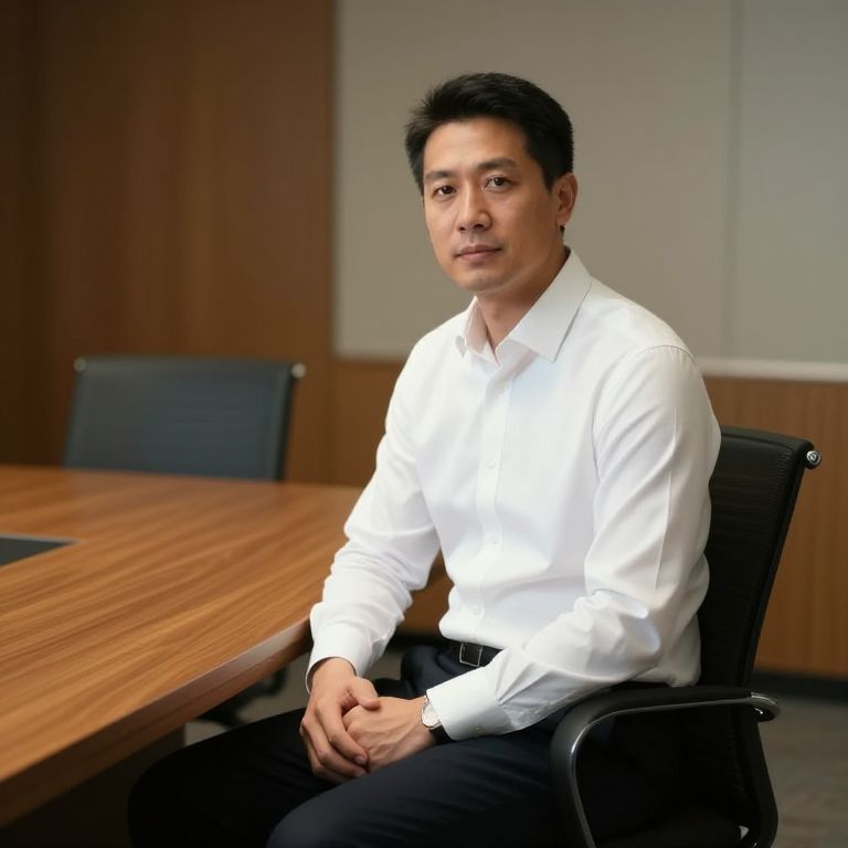 Executive look prompt: A behind-the-scenes moment of an executive in a polished business meeting, seated on a wooden conference table, wearing a crisp white shirt and dark pants, with subtle cues of professionalism and calm authority.