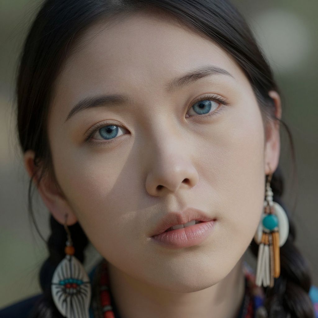 An iPhone portrait showcases a Native American woman with striking blue eyes and delicate features set against pale skin. Viewed from an unconventional worm's-eye perspective, her high cheekbones and full lips are accentuated as she leans forward in thought. Soft natural lighting above casts subtle shadows across her face, enhancing its contours and evoking a sense of contemplation.