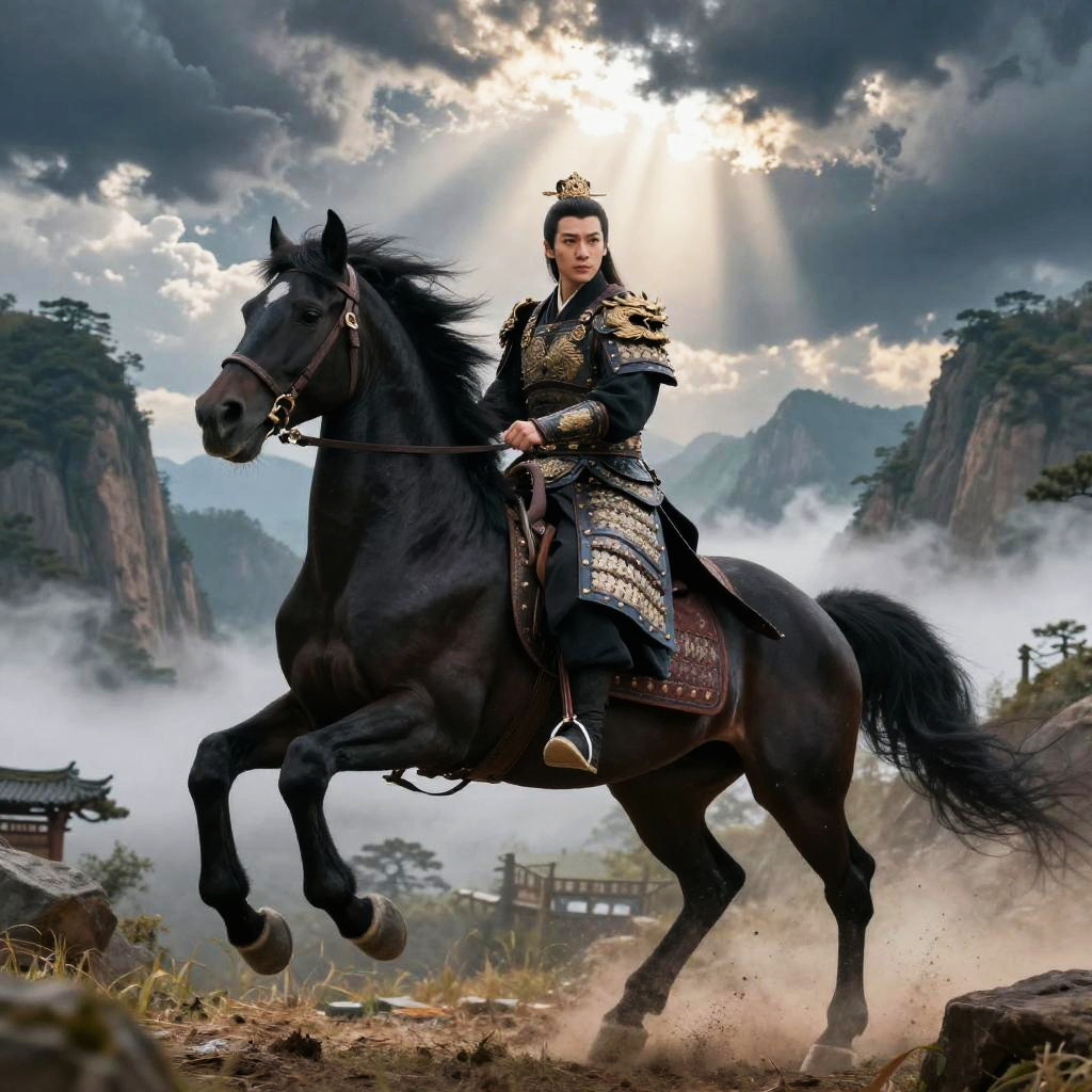 Digital artwork of a regal Asian warrior in ornate armor riding a powerful black horse, set against a dramatic mountainous landscape with sunbeams piercing