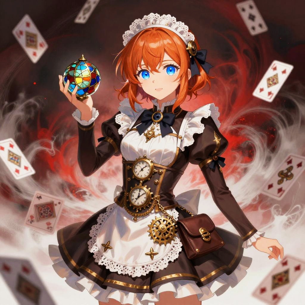 Anime style female character with copper-orange hair and sapphire blue eyes, wearing a Victorian clockwork maid uniform with lace apron, brass gear accents, and a small pocket satchel, holding stained-glass orbs, surrounded by floating playing cards. The scene features a dynamic swirling smoky background with bright red and white highlights, intricate costume details, sharp expressive eyes, and an energetic and magical atmosphere. Rendered in high contrast and vibrant colors as detailed digital art.
