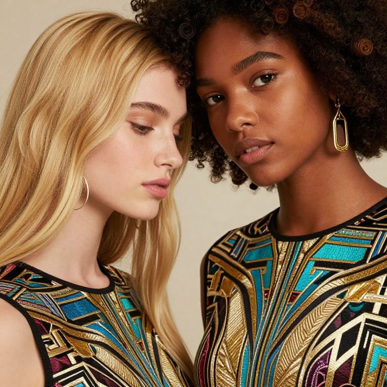 Extreme Close-Up Shot Of Style Inspired Clothing On The Style Inspired Clothing, Afro American girl and long haired blonde girl cuddling, in the style of art deco,