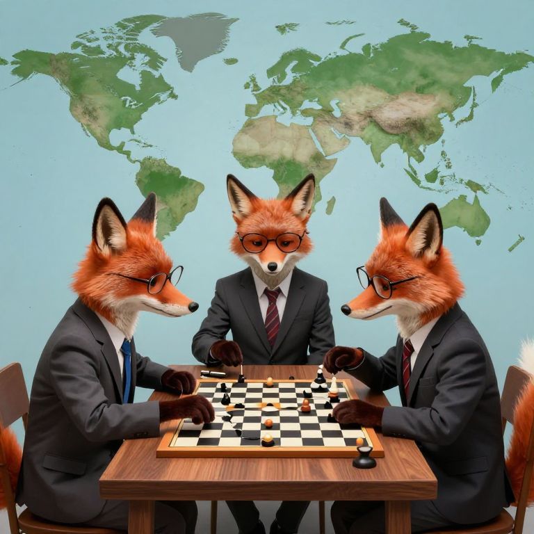 In a surreal digital illustration, anthropomorphic foxes dressed in formal suits and glasses engage in strategic board games, symbolizing global cooperation and problem-solving against a backdrop of a world map, blending whimsical fantasy with serious diplomatic themes.