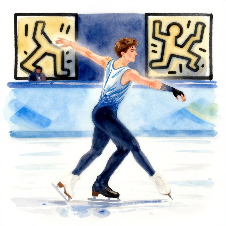"Contrast graceful:: adam rippon skating at the winter olympics, watercolors, thick brushstrokes:: style of keith haring, yuumei, mondrian::0.4,"