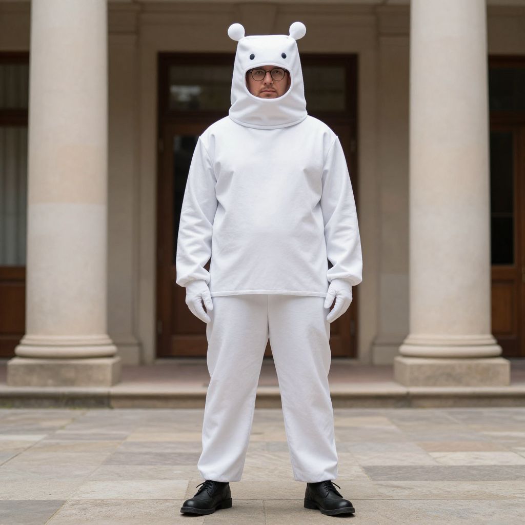Photograph of a person standing in front of a classical building with tall columns. The individual is wearing a white, full-body costume with bear ears on the hood, long sleeves, and pants, along with black shoes. The costume is loose-fitting and covers the person entirely, with white gloves on their hands. The person's face is visible through the hood, showing a neutral expression. The background includes stone steps and a stone-paved ground. The lighting is natural, and the overall scene is bright and evenly lit.