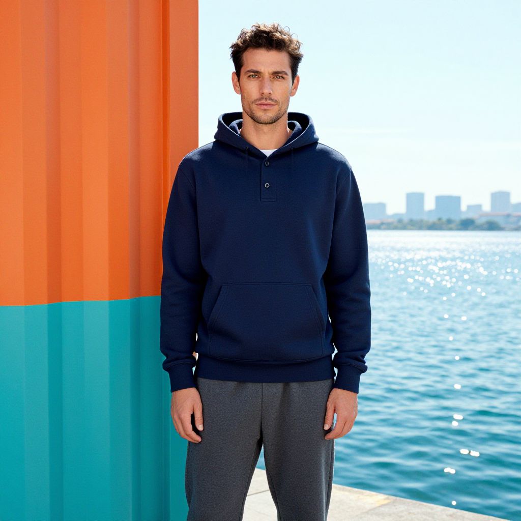 A man, soft cotton henley hoodie in navy blue, lightweight fleece jogger pants in charcoal gray, relaxed fit, minimalistic design, vibrant shipping containers, glistening water, distant city skyline, oversaturated film, relaxed expression. Man has masculine face and piercing eyes