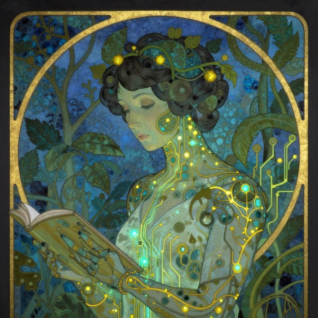 Art Nouveau Android Botanist with Bioluminescent Vines
