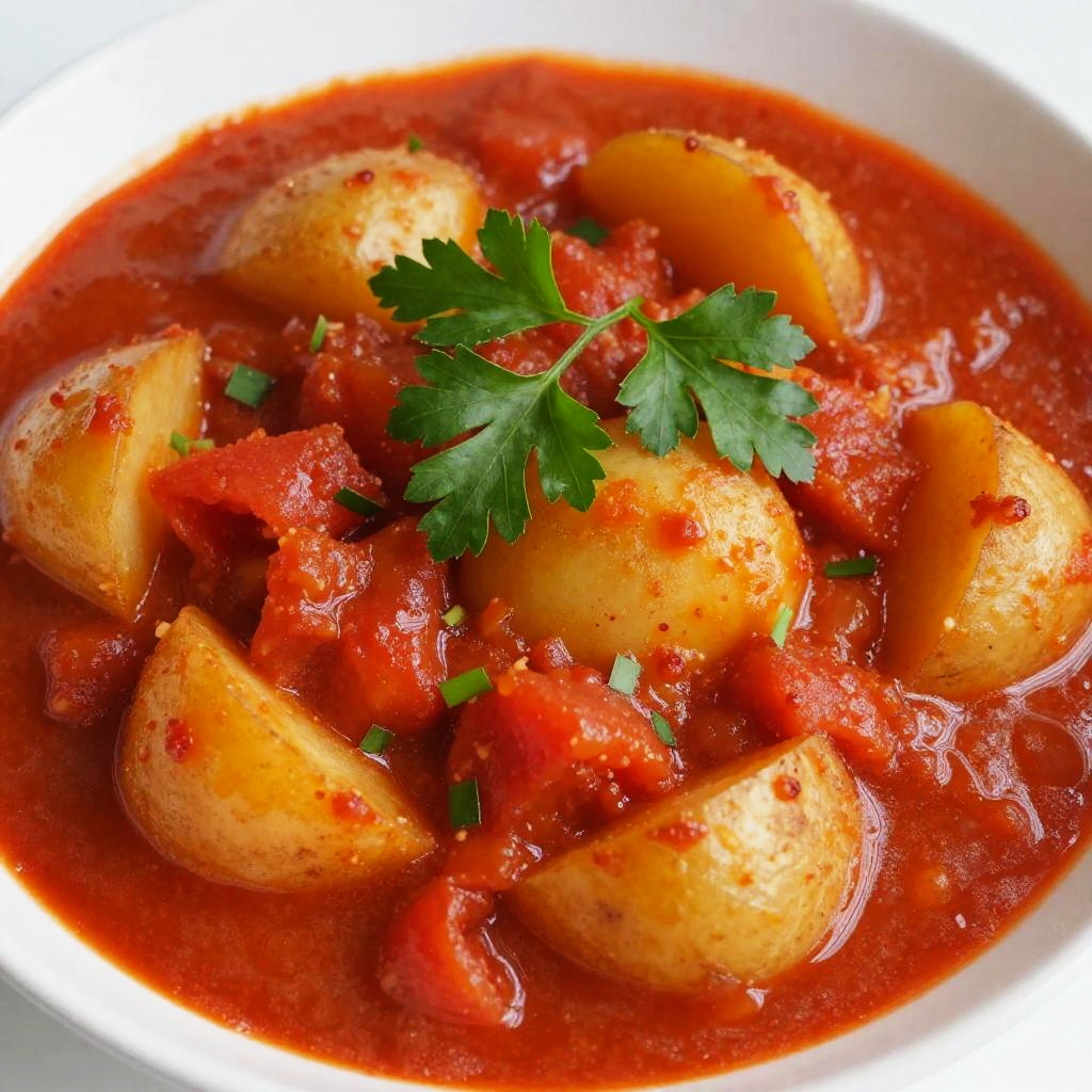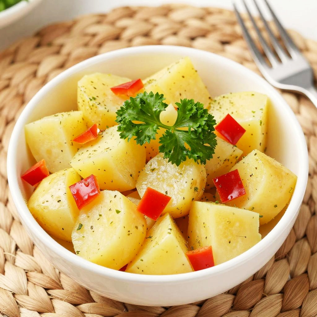 This colorful photo shows a close-up of a white bowl filled with yellow potato salad, mixed with small red bell pepper pieces and sprinkled with green herbs. A fresh green parsley garnish sits on top. The bowl is placed on a woven, beige placemat with a shiny fork to the right. The image has a bright, vibrant feel.