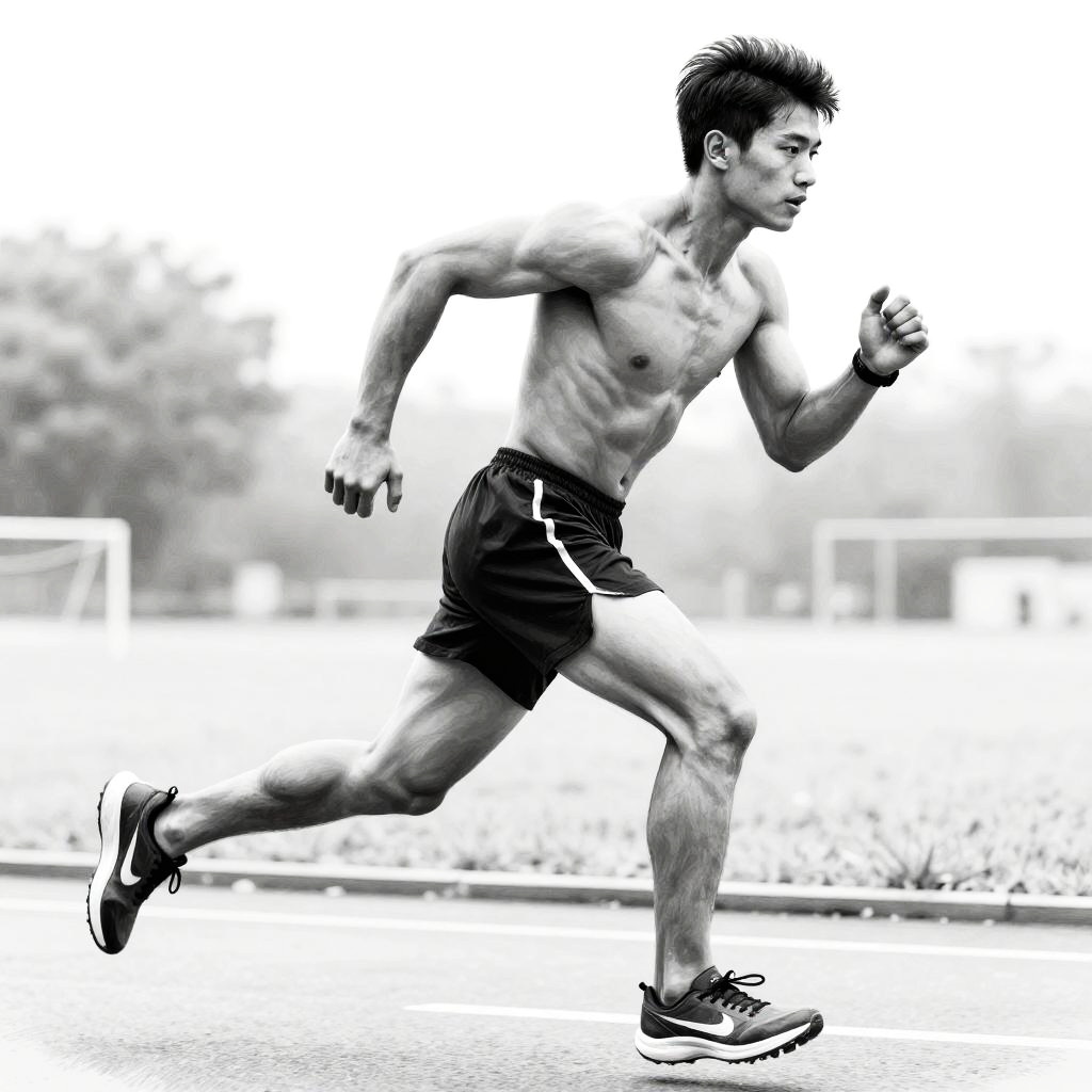 Black-and-white photograph of a muscular, shirtless Asian male runner in shorts and sneakers, mid-stride outdoors with blurred background.