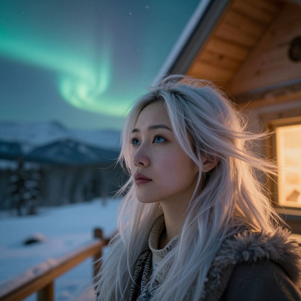 A captivating portrait photograph captures an enigmatic East Asian woman with striking ice-blue eyes and windswept platinum hair illuminated by the ethereal glow of the Northern Lights. Her expression exudes a blend of serenity and deep contemplation; her gaze is directed thoughtfully towards the horizon. The soft, warm light within her cozy timber-clad cabin, nestled among frosty peaks in a snow-capped mountain range, accentuates her delicate features. The unique 'bug's-eye view' perspective offers an intimate glimpse into the world of this fierce and resilient forest guardian, inviting viewers to immerse themselves in the tranquil beauty of her surroundings. The interplay of light and shadow on her visage evokes an emotional gradient of introspection and awe.