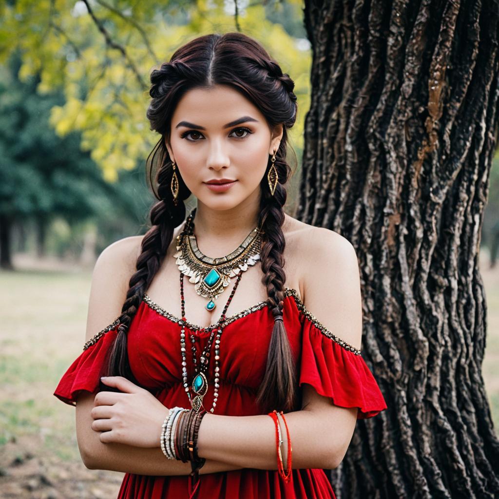 Portrait of a young woman with long braided dark hair wearing a vibrant red off-shoulder dress and ornate jewelry including intricate necklaces, earrings, and multiple bracelets. She stands outdoors near a tree with a blurred natural background, looking confidently at the camera.
