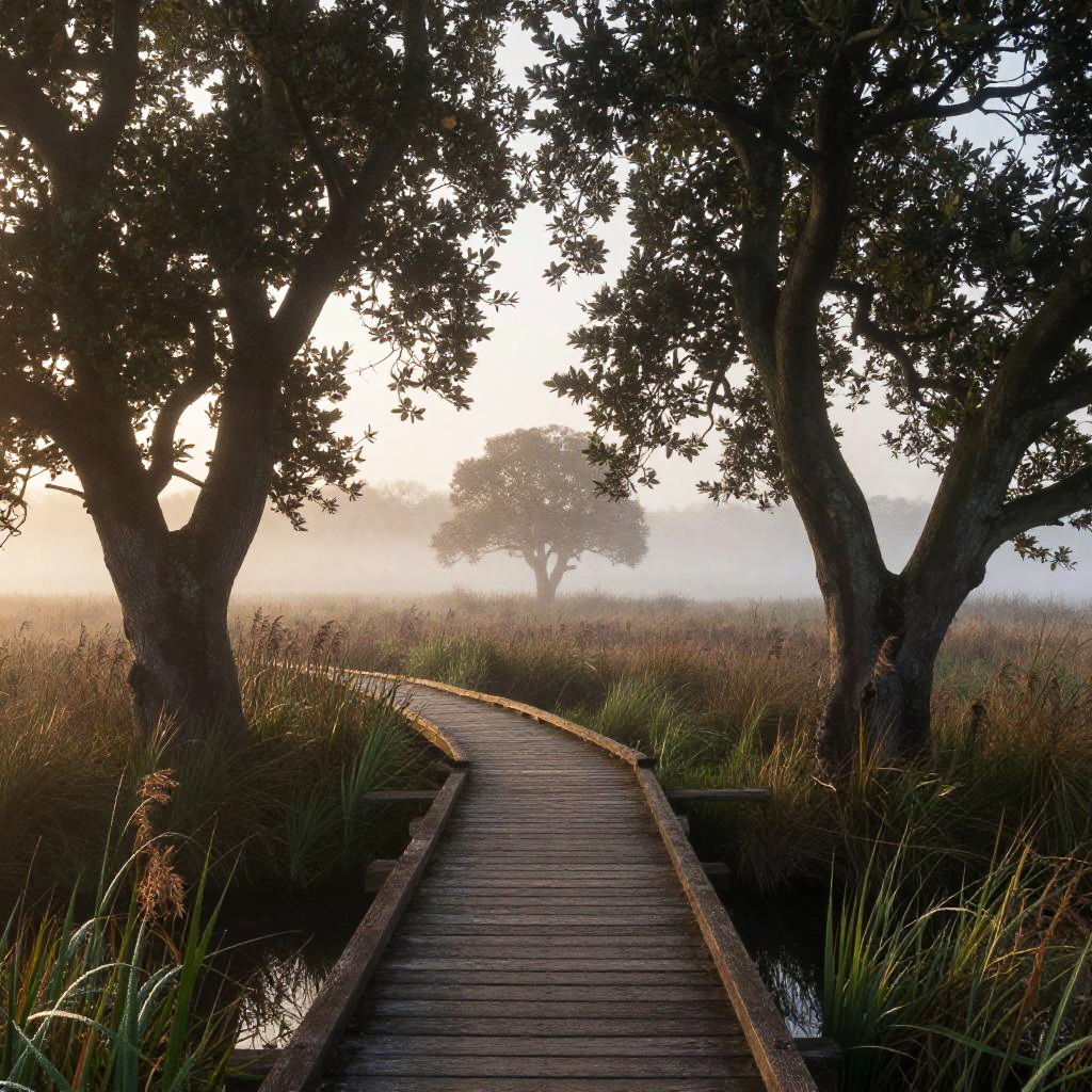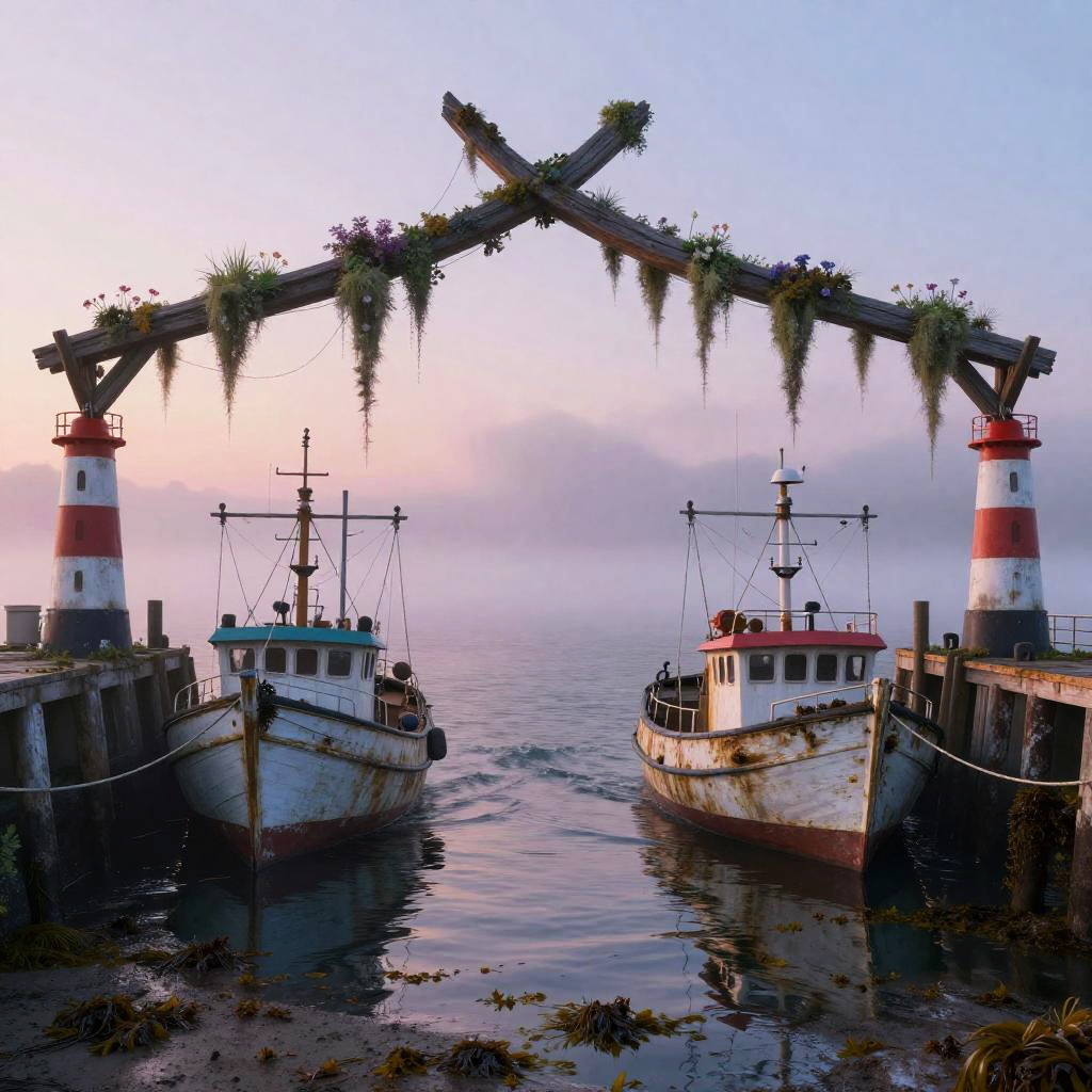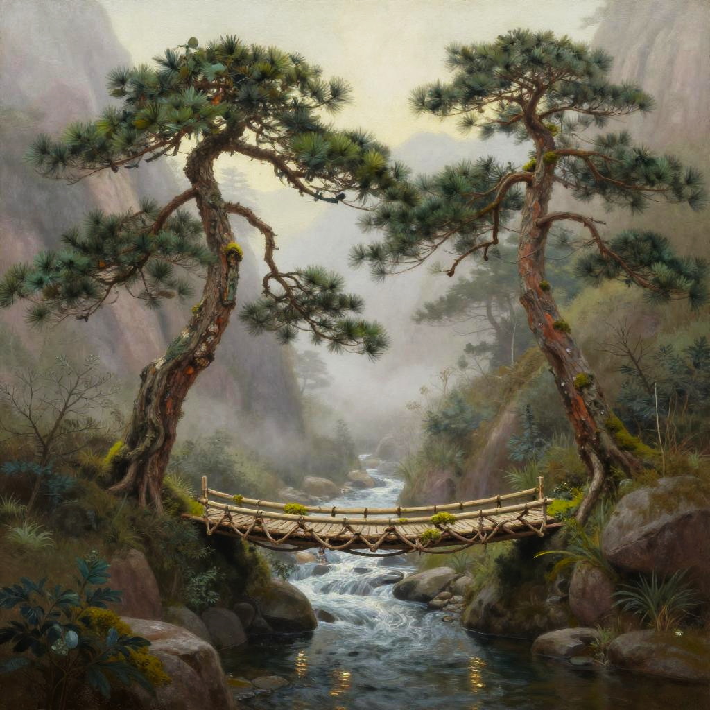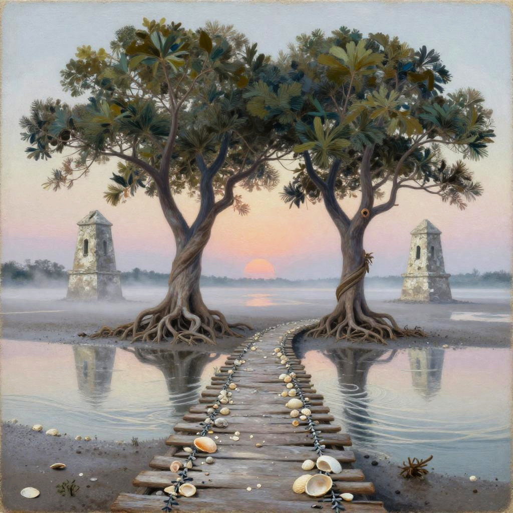 Tempera-on-gesso twilight lagoon, bioluminescent shallows and drifting phosphorescent pollen, two hybrid stone-and-tree spires rising from mirror-smooth water under a violet-gold sky ::10, left spire cradles a cracked reflective shard like a confession, its root-wrapping arms bowed in remorse; right spire unfurls glowing lantern-orchids and tender new shoots, open and ready to forgive ::8, intertwining forms create a gentle canopy above the scene, connection and understanding ::6, deep indigo shadows blend with soft lavender light, serene and mystical ambiance ::4, gentle ripples with glowing highlights ::2, low-limbed living bridge woven from braided aerial roots and bioluminescent fungus, stitched with trailing vines and tiny lanterns, a tended passage symbolizing reciprocal care and reunion ::1, soft textures, natural color grading, subtle atmosphere, high detail