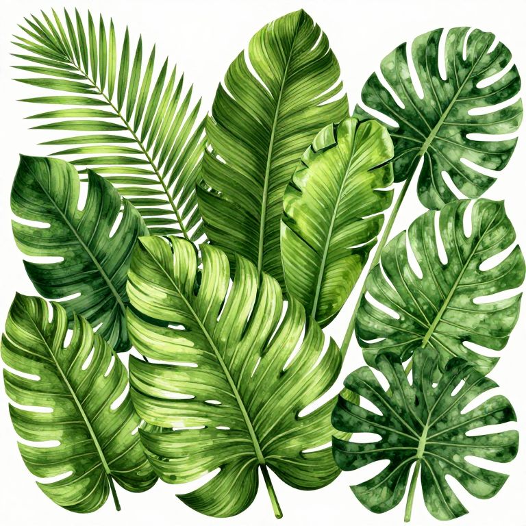 A detailed digital illustration features a cluster of vibrant green tropical leaves, including large monstera leaves with characteristic split patterns, broad banana leaves, and feathery palm fronds. The leaves are meticulously shaded, showcasing varying green hues and textures that mimic natural light and shadow. The background is plain white, highlighting the lush foliage. The illustration style is realistic with a touch of botanical art, emphasizing the intricate details and natural beauty of the leaves.