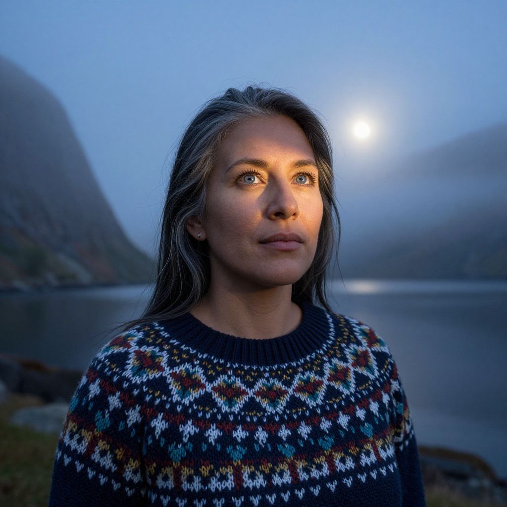 A portrait photograph captures the enigmatic gaze of a Hispanic woman with piercing blue eyes, set against the backdrop of a misty fjord under twilight skies. She wears an intricately woven traditional Norwegian sweater, its deep hues mirroring the fading light. Soft moonlight pierces through the dense fog, casting ethereal shadows on her serene face and illuminating strands of silver-streaked hair. From a unique low-angle perspective, the portrait emphasizes the depth and mystery within her eyes, reflecting ancient secrets whispered by the surrounding elements and evoking a profound sense of introspection and connection to nature's timeless allure.