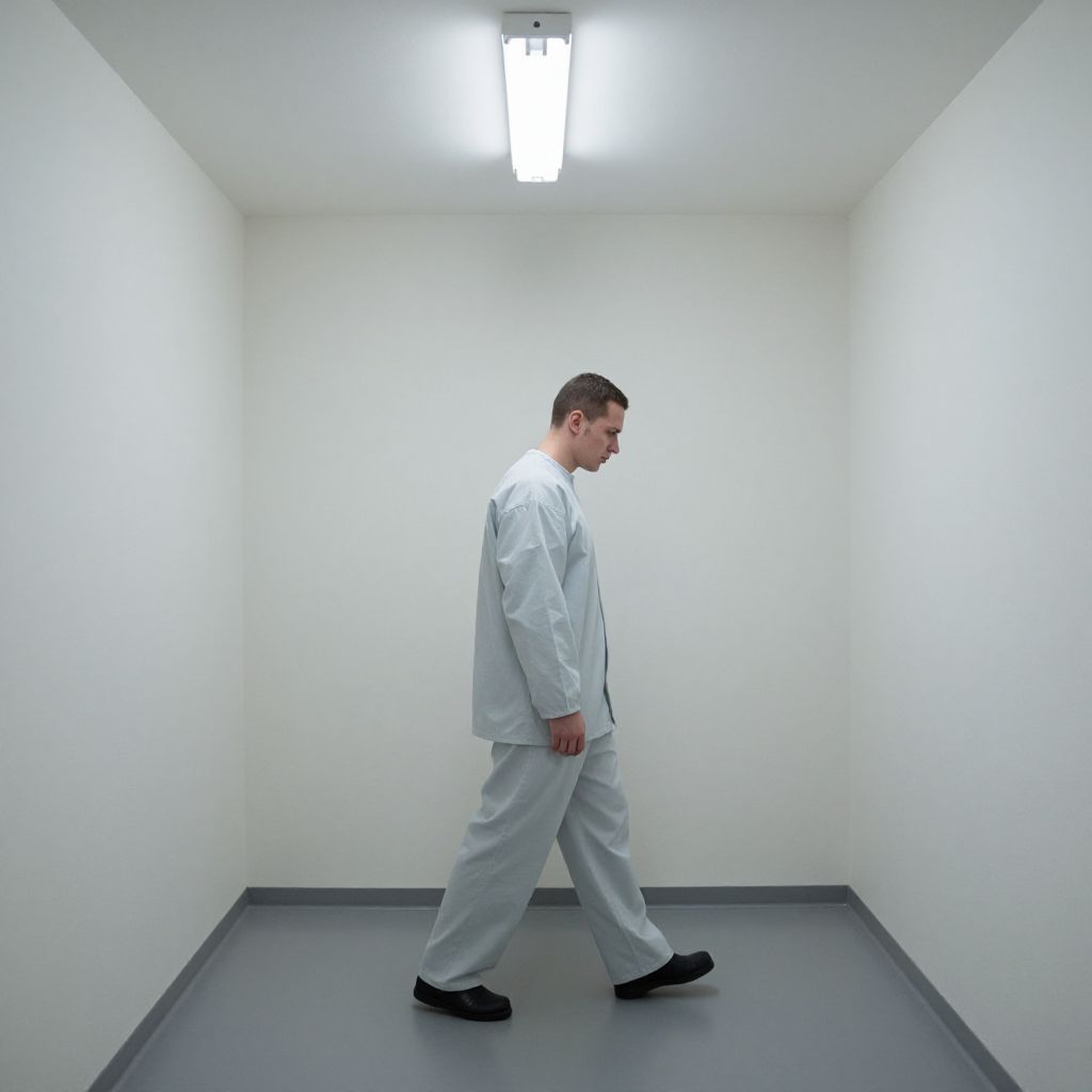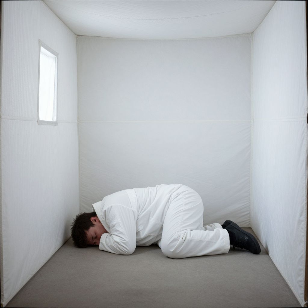 Man in padded cell sitting alone, dimly lit room, soft textured walls, melancholic expression, muted colors, surreal lighting, psychological tension, digital art style