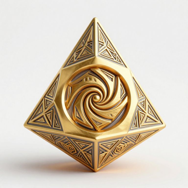A 3D rendering of a tetrahedron with intricate, geometric patterns and a golden, spiral design, reminiscent of the golden ratio.