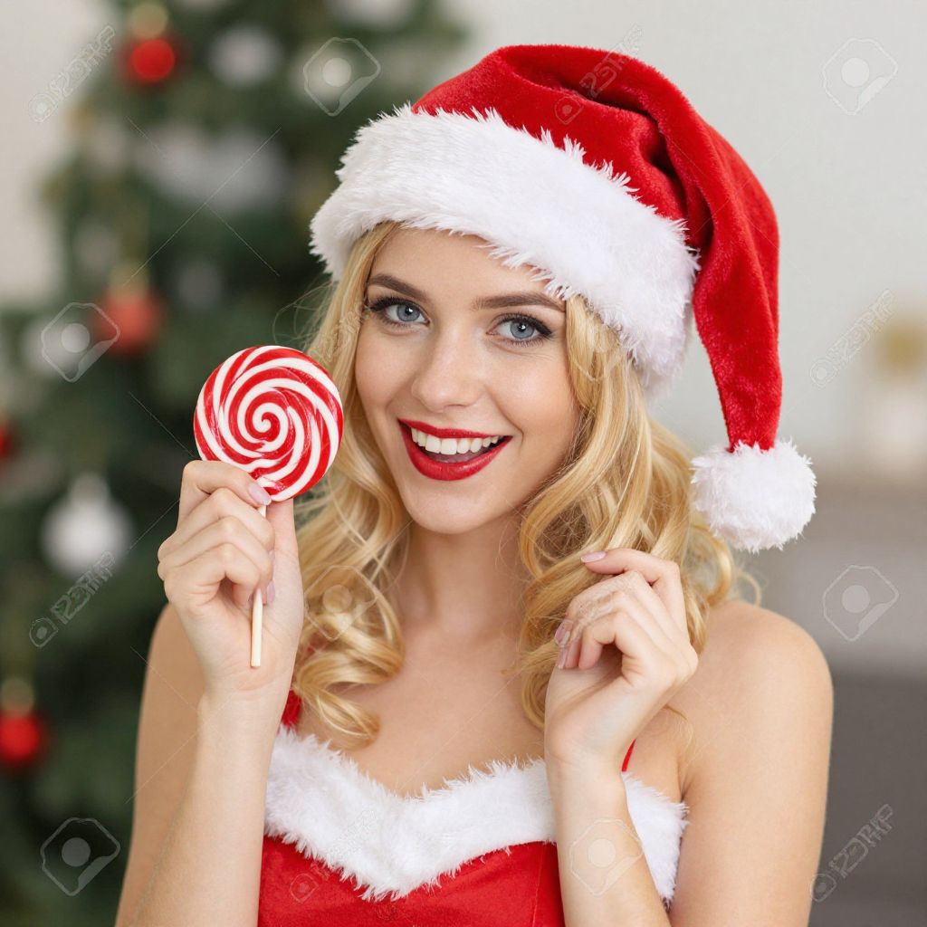 Download Young Blond Woman In Santa Hat With Candy Stock Photo - Image: 28147548
