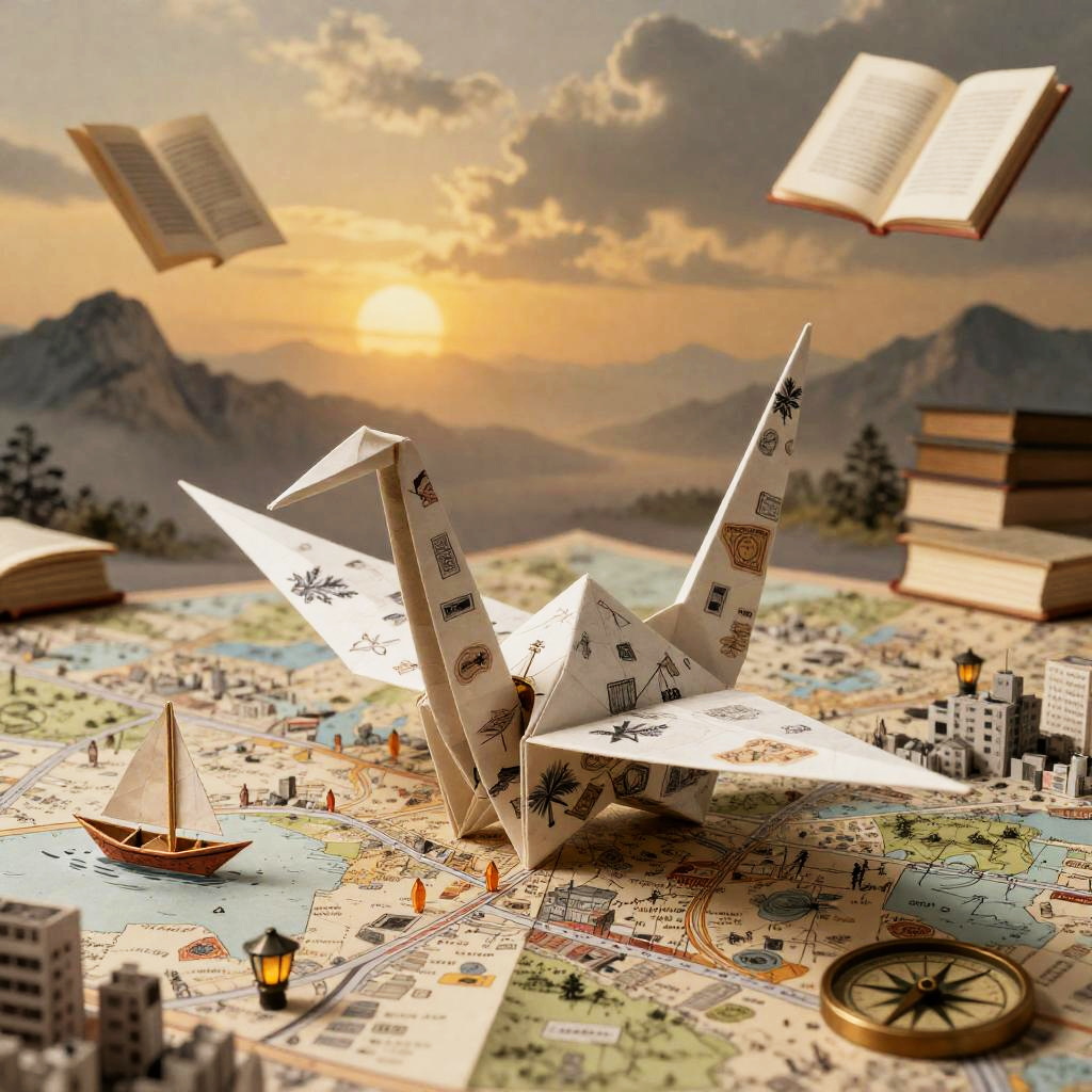 A surreal artwork depicting a vast origami crane constructed from folded maps, its wings studded with miniature paper cities, showcasing paper-sailboats drifting through creased valleys, ink-stamped streets, tiny lanterns made of stamps, and bronze compass mechanisms embedded in the folds, in a boundless library-sky where floating pages form clouds and book spines rise like distant mountain ranges at golden hour, painted in hyper-detailed mixed-media collage with papercraft textures, ink wash accents, and warm sepia highlights, awe-inspiring and imaginative