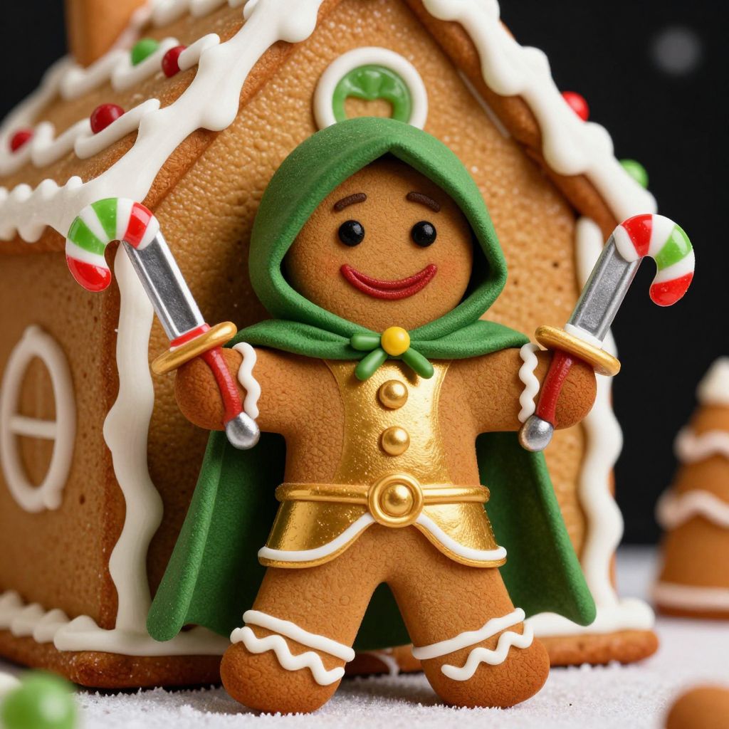 Photograph of a gingerbread man cookie with green hood, gold armor, holding candy canes, standing in front of a decorated gingerbread house.