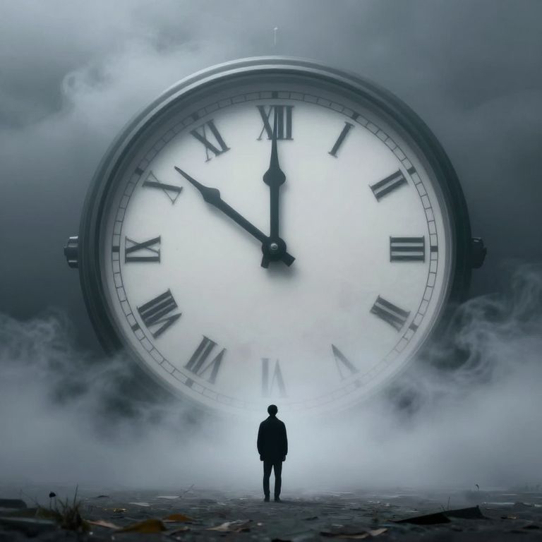 A surreal digital artwork depicts a colossal clock encircled by swirling fog, its hands ticking backward as a solitary figure stands before it, evoking themes of time reversal and introspection in a hauntingly atmospheric setting.
