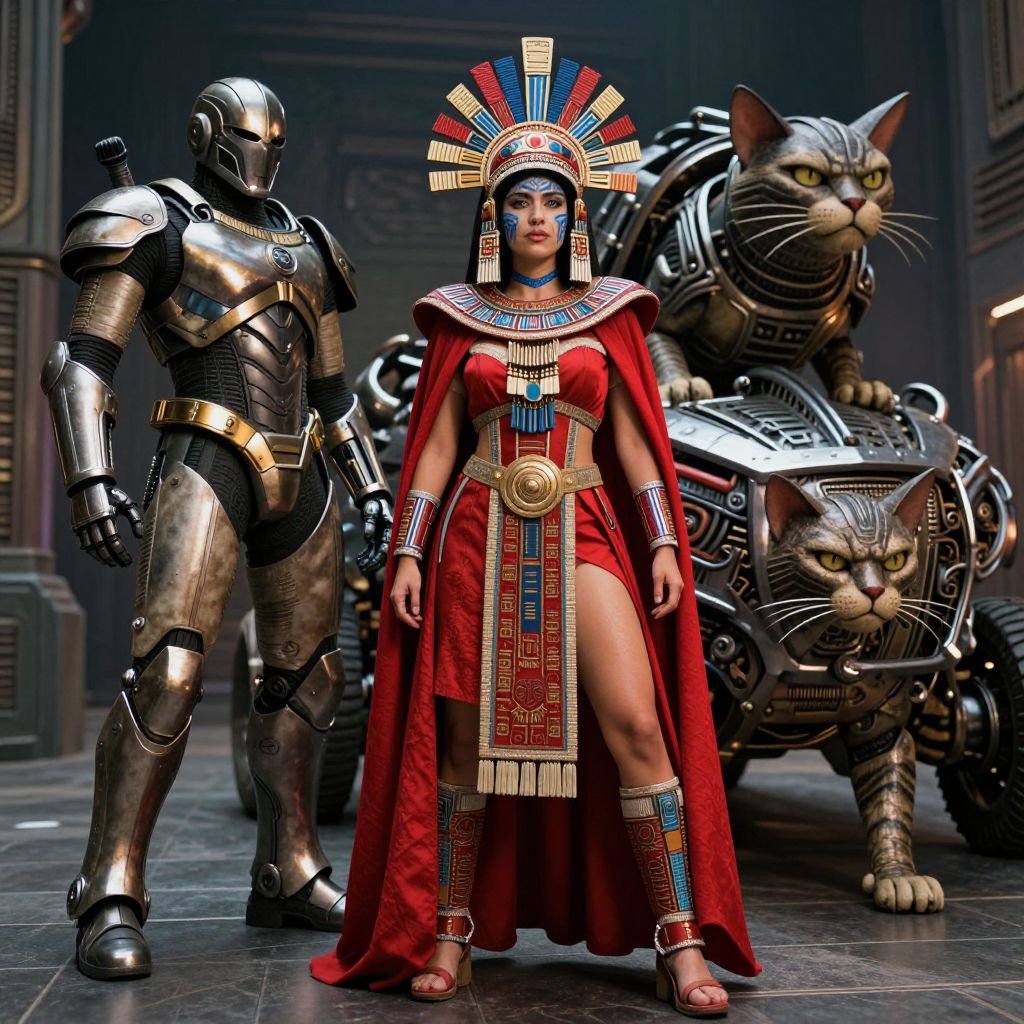 In this highly detailed and cinematic scene, a woman dressed as an Aztec princess stands confidently in the center, her attire a striking blend of traditional and futuristic elements. She wears a red cape and a headpiece adorned with intricate designs, her face painted with blue and gold patterns. To her left, a robotic metal and latex armor suit stands tall, its form reminiscent of a futuristic warrior. Behind her, a large, mechanical vehicle with a metallic frame and intricate details is visible, accompanied by a large, striped cat-like creature with a fierce expression. The background is a dimly lit, industrial setting, with a sense of depth and perspective created by the arrangement of these elements. The overall composition is dynamic, with the woman and the armored figure positioned in the foreground, the vehicle and the cat-like creature in the mid-ground, and the industrial background providing a contrasting backdrop. The lighting is professional, with a focus on highlighting the textures and details of the costumes and props, creating a visually striking and immersive scene.