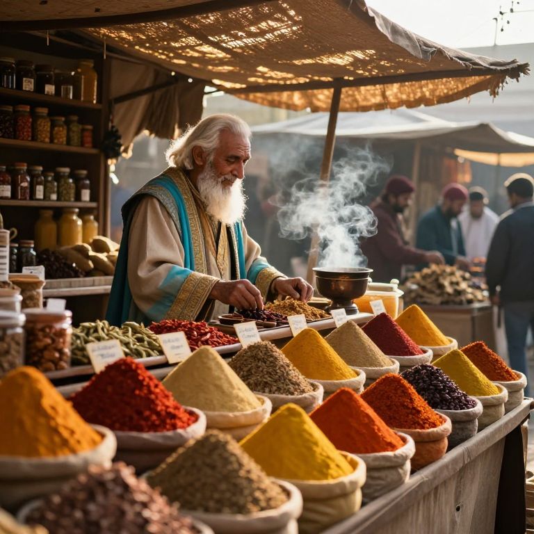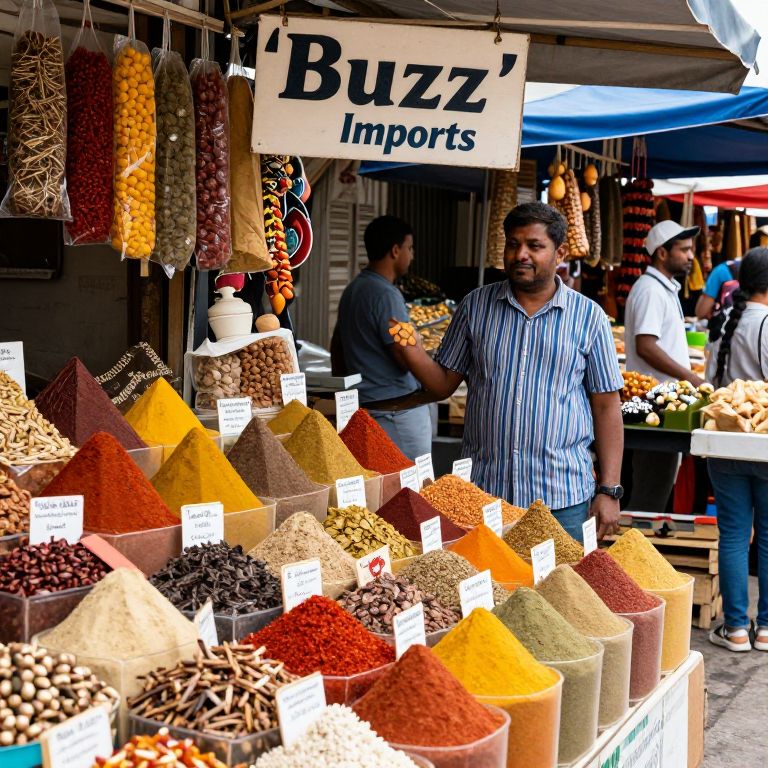 A bustling street market where vendors are selling all manner of exotic goods, One stall features a sign reading \"'Buzz' International Imports\", while the vendor themselves is proudly displaying their latest shipment of rare spices