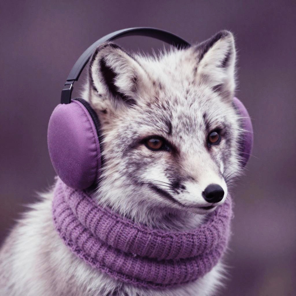 Head and shoulders portrait of an arctic fox wearing a woolen scarf and earmuffs, looking off-camera. Captured in Lomochrome Purple analog film style with a vintage feel and an oil-on-canvas texture.