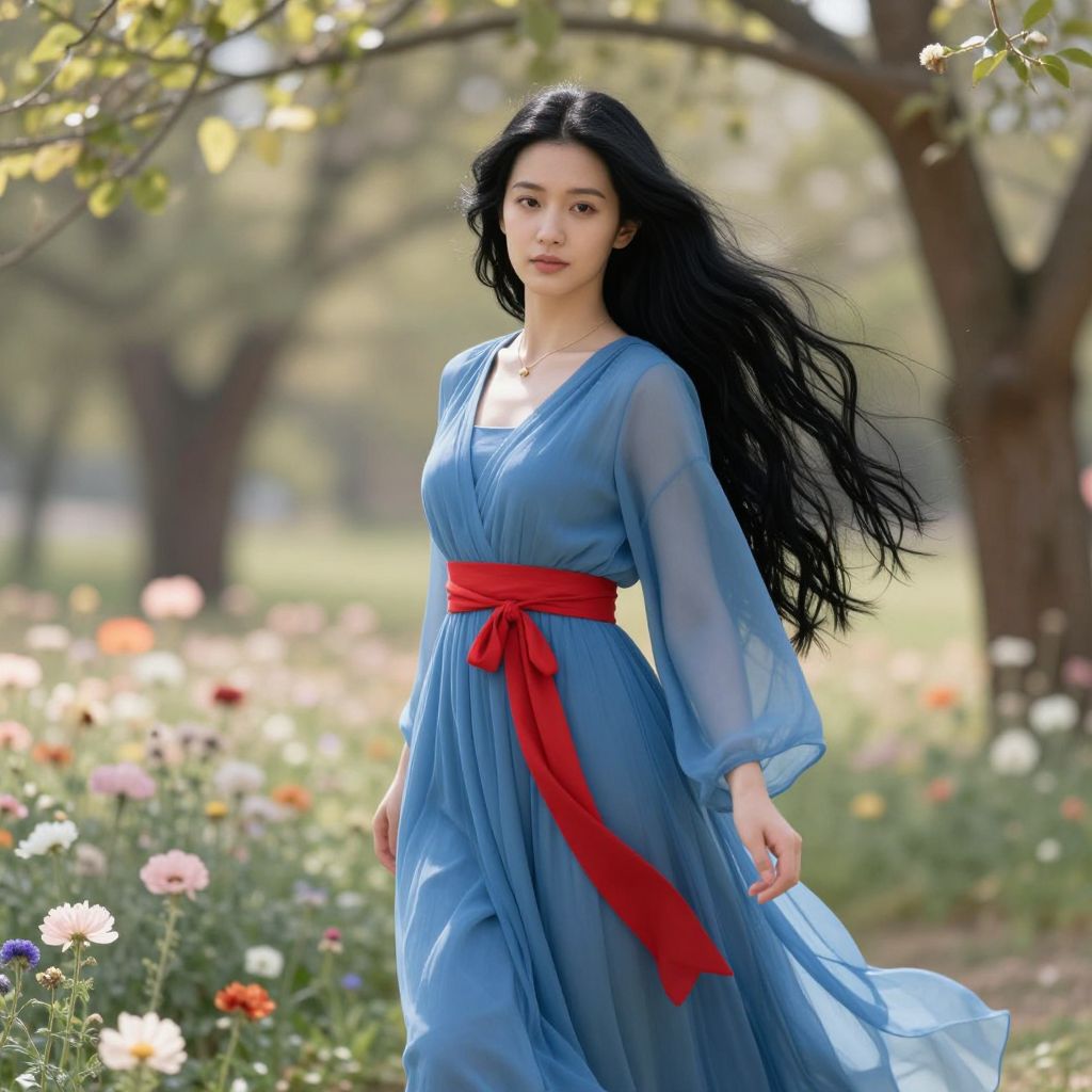 A beautiful young woman with long, flowing black hair that cascades down her back like a whisper of night, wearing a delicate blue chiffon dress that flows gently with her movements, accented by a vibrant red sash that wraps elegantly around her waist, adding a touch of bold contrast. A subtle gold necklace glimmers softly with every motion, catching the light like dew on petals. She stands in a serene, softly lit outdoor setting—perhaps a sun-dappled meadow or a quiet garden—surrounded by blooming flowers in soft pastel hues and dappled sunlight filtering through the trees. The atmosphere is peaceful and tranquil, with a gentle breeze rustling the leaves and flowers. Her expression is calm and serene, radiating quiet confidence and inner grace, as if she is in harmony with the natural world around her.
