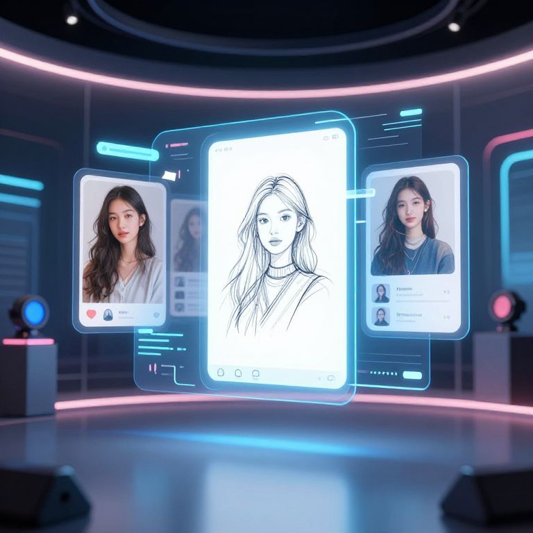 Digital interface showing three women's portraits: one live photo, one black-and-white line drawing, one colored photo. Neon blue and pink lights in futuristic