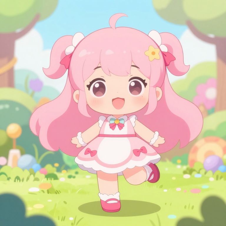 Cute anime-style chibi girl with pink hair, white dress, and red bows, running joyfully in a colorful, sunlit garden.