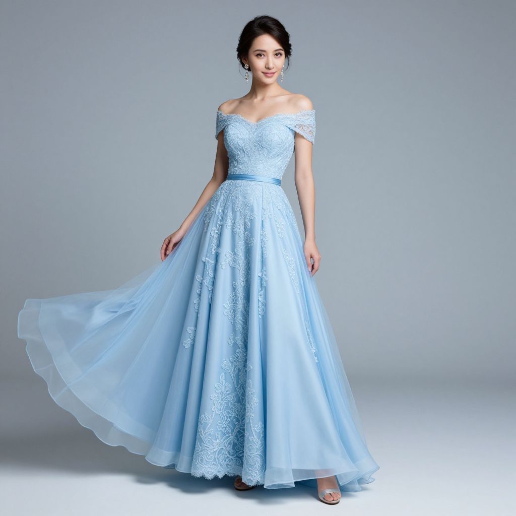 Elegant woman posing gracefully in a light blue princess gown featuring off-the-shoulder sleeves, intricate lace detailing, and a flowing skirt with sheer ruffled edges, complemented by sparkling earrings and high heels.