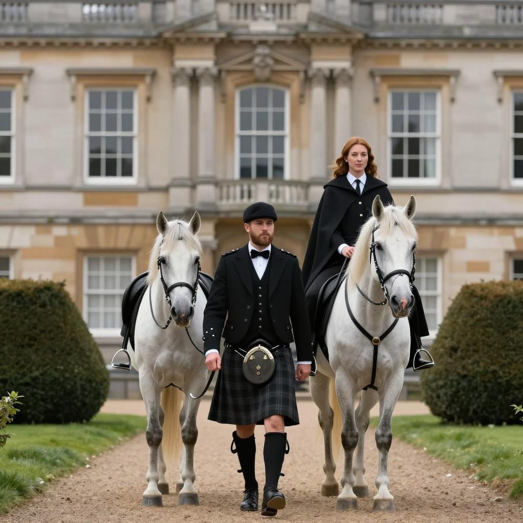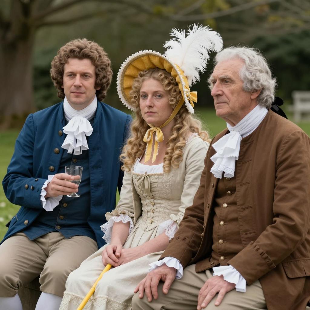 Historical reenactment photograph. Women in elaborate, white, 18th-century dresses with large feathered hats, standing in a carriage with white feathers. Male in brown suit, hat, and white stockings, holding reins of a decorated horse. Drummer with large drum on left. Background: trees, people in period clothing. Sunlight casting shadows on grass. Carriage has white curtains and large feathers. Multiple white feather plumes visible. People looking at the carriage.