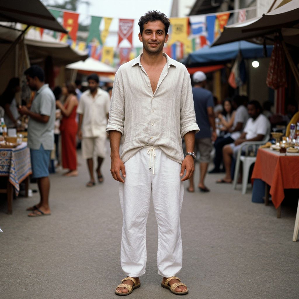 A man, light beige linen shirt, loose fit, rolled-up sleeves, soft white cotton drawstring pants, natural woven sandals, earthy tones, relaxed vibe, vibrant street stalls, colorful banners fluttering, lively music echoing, ektachrome film stock, warm smile, enjoying the atmosphere.Man has masculine face and piercing eyes