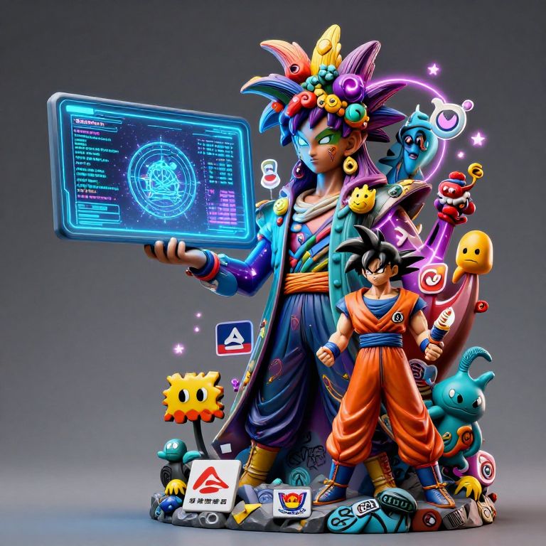 A futuristic sculpture depicts a deified individual covered in magical spells and deities, holding a digital multimedia interface screen with occult code and space invaders integrated into a Niki de St Phalle sculpture of Dragon Ball, surrounded by corporate logos and graffiti.